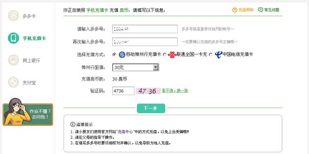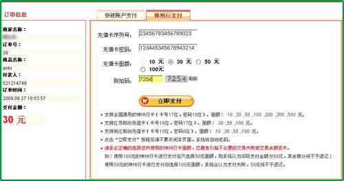 4. 系统会弹出神州行的支付页面,按照页面提示填写充值卡号. 密码和金额;